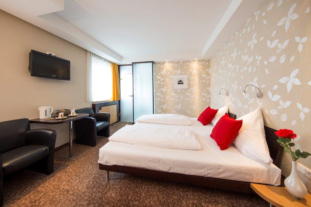 Superior-Zimmer (Queen-Size-Bett) Unsere sehr ruhigen 20 m² großen Superior-Zimmer sind modern und individuell. Sie sind hochwertig eingerichtet und verfügen über 140 cm breite Queen-Size-Betten. Eine Minibar rundet die Standardausstattung wie Schreibtisch, Kaffee- und Teestation, Safe, Flachbild-Sat-TV und Gepäckablage ab. Das geräumige Badezimmer verfügt über eine Dusche und ein WC.